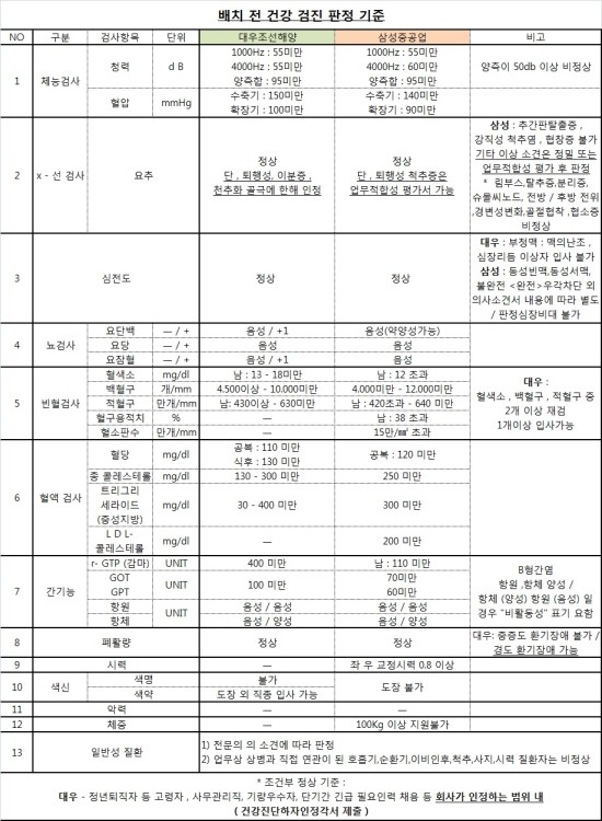 조선소 배치전 건강검진 채용검진 판정 합격기준표 경남 거제 삼성중공업 네이버 블로그