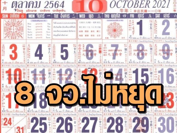 วนจนทร-ศกร เวลา 1740 - 1800 น. 2564 เวลา 1340 น. ทำใหในเดอนตลาคมน ทวประเทศจะมวนหยดยาวพรอมกนในวนท 22-24 ตลาคม สวนภาคกลางจะเรมหยดตงแตวนท 21-24 ตลาคม ในสวนของวนหยด.